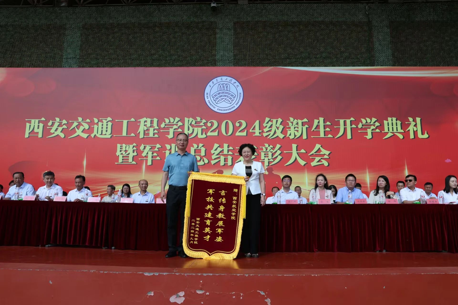 党委书记李萍为2024届新生军训承训单位赠送锦旗