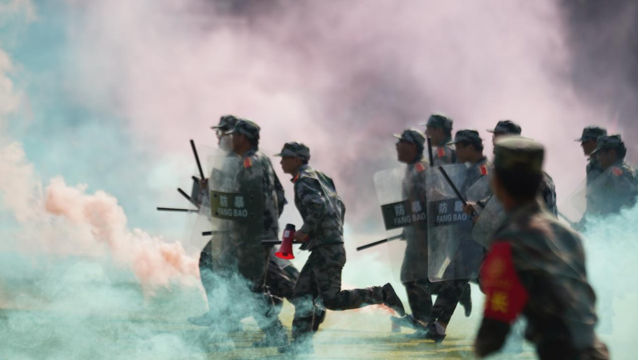 大会在庄严肃穆的国歌声中拉开序幕,精彩的军训汇报演出有序开始。国旗护卫队队员们手举校旗,气宇轩昂,从一营一连到六营二十八连,一个个方阵以饱满的精神风貌、蓬勃的朝气,昂扬的斗志,和着震天响的口号,迈着整齐有力的步伐,依次通过主席台接受检阅;随后,花样方队像一张画卷般铺开,通过队列编排呈现“1994”“2024”这两座beat365校史中熠熠生辉的里程碑,纪念beat365三十载春华秋实风雨兼程,并用倒计时的手法呈现数字“75”,为伟大祖国繁荣昌盛七十五载送上最真切的祝福。除此之外,匕首操、舞旗、军体拳、擒敌拳、战术与防爆训练……每一次迈出都踏出坚定的信念。每一个动作都彰显着青春的活力和果敢。