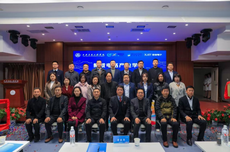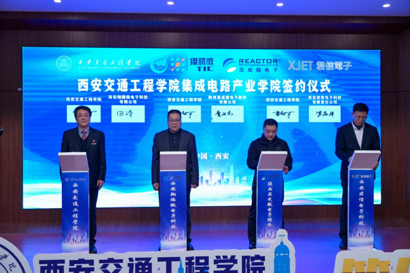 仪式中,学校与西安翔腾微电子科技有限公司、陕西亚成微电子股份有限公司、西安君信电子科技有限责任公司签订校企合作协议。随后,校企合作双方共同为产业学院揭牌并合影留念。