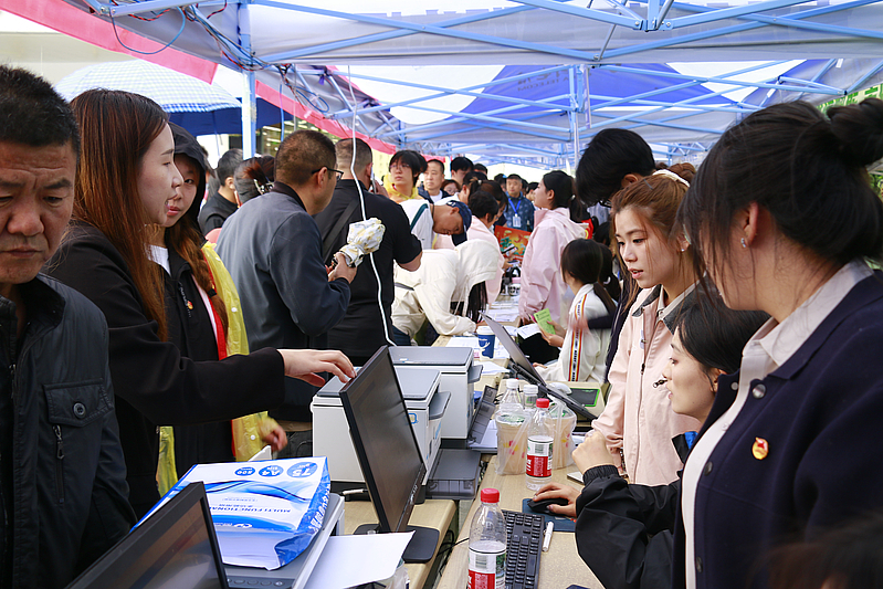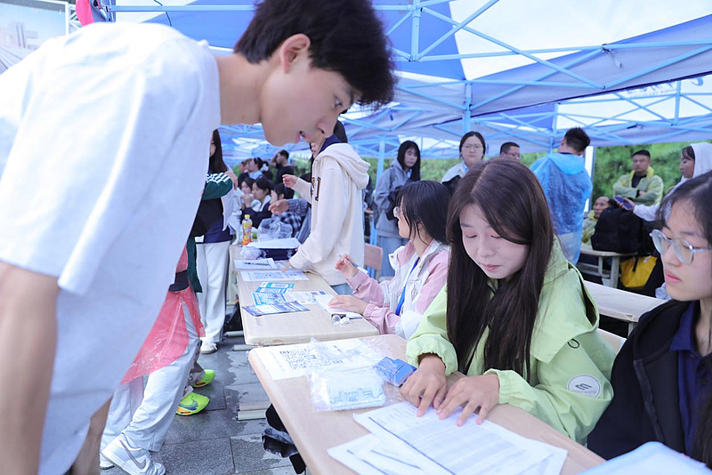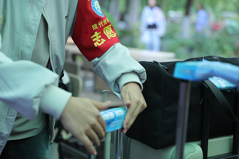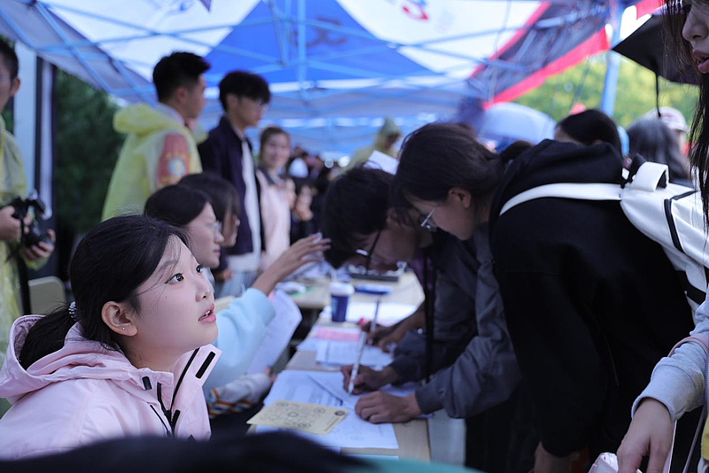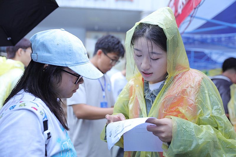 在报到现场,身着志愿服务马甲的志愿者们穿梭如风