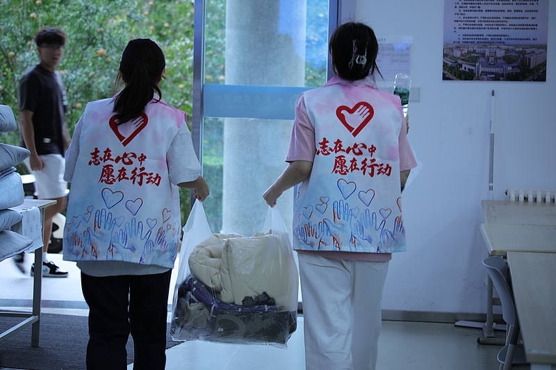 图书馆南侧,一床床整齐装叠的被褥及军训服被志愿者们送至每一位新生手中