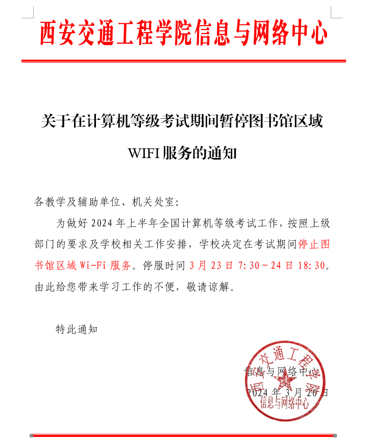 关于在计算机等级考试期间暂停图书馆区域WIFI服务的通知