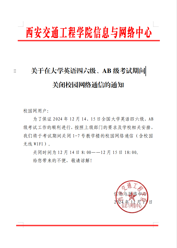 关于在大学英语四六级、AB级考试期间关闭校园网络通信的通知