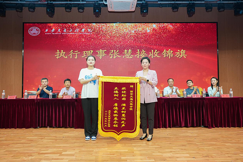 执行理事张慧接收获奖学生代表为学校赠送的锦旗。