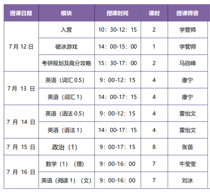 本次夏令营开设了考研英语、考研政治和考研数学等课程。除了考研公共课程的学习外,还安排了专门的老师帮助同学们制定复习规划、高分攻略和择校择专业。为了让同学们有更好的状态学习,增进感情和团队凝聚力,还安排了破冰游戏,让同学们劳逸结合,展示个人魅力与发掘潜能。