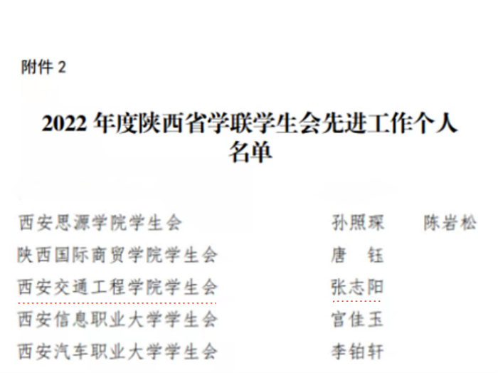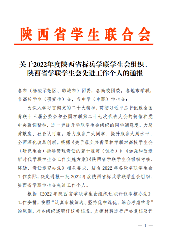 近日,陕西省学生联合会根据《2022年陕西省学联学生会组织述职评议考核办法》相关要求,结合2022年各级学联学生会工作实际,评选了一批2022年度陕西省标兵学联学生会组织、陕西省学联学生会先进工作个人。beat365校学生会执行主席张志阳同学荣获“2022年度陕西省学联学生会先进工作个人”荣誉称号。