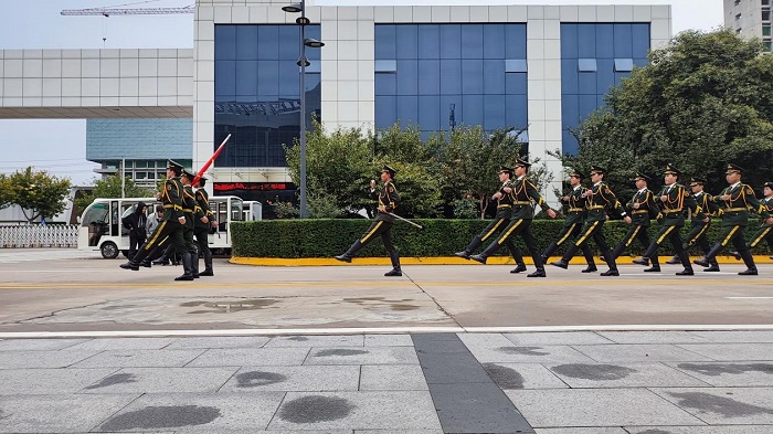 在铿锵有力的步伐和整齐嘹亮的口号声中,国旗护卫队队员们护送鲜艳的五星红旗入场。