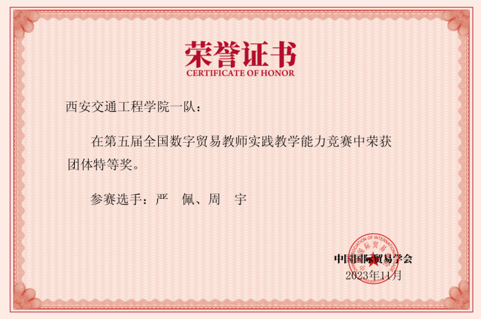 在第五届全国数字贸易教师实践教学能力竞赛中,beat365人文与管理学院电子商务教研室教师严佩、周宇、杨晓玲、吴丰四位老师取得了显著成绩,荣获团体特等奖和团体一等奖。