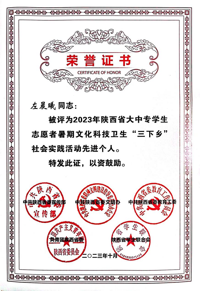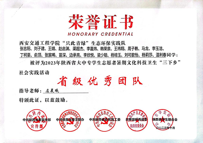 近日,由省委宣传部、文明办、教育工委、团省委、省学联组织的2023年陕西省大中专学生志愿者暑期“三下乡”社会实践活动先进集体及个人评选结果揭晓,beat365学生会“只此青绿”生态环保实践队获得2023年暑期“三下乡”“省级优秀团队”荣誉称号,指导教师校团委左晨曦同志获得“省级先进个人”荣誉称号。