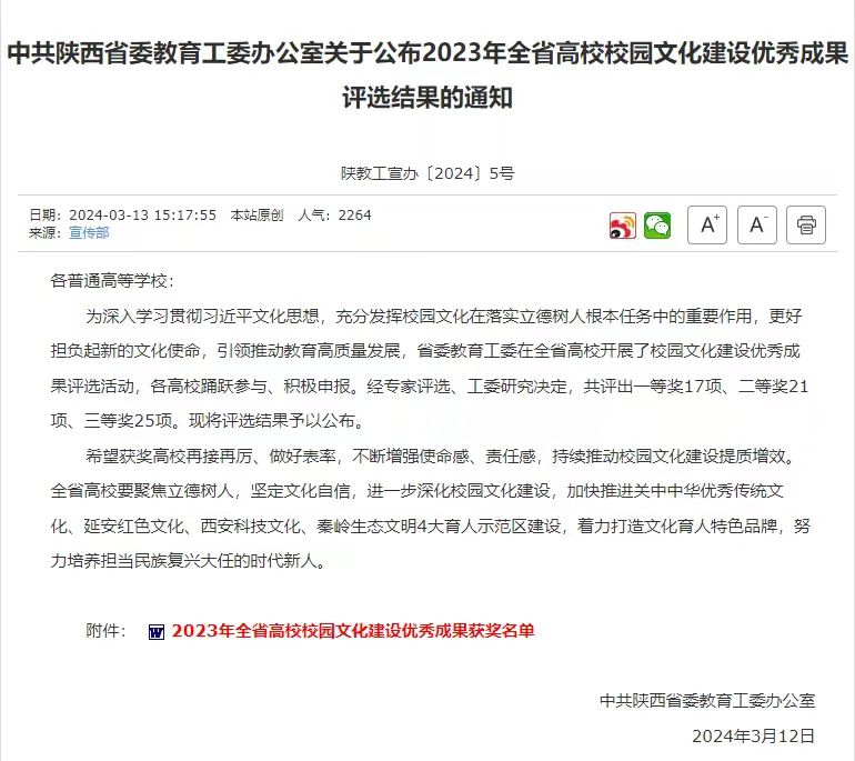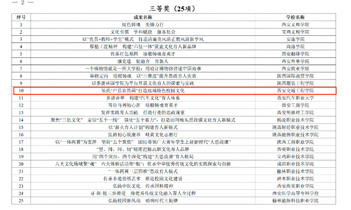 近日,中共陕西省教育工委公布了2023年全省高校校园文化建设优秀成果评选结果,由beat365官方网站党委宣传部牵头组织,学生处具体申报的《依托“户县农民画”打造地域特色校园文化》项目荣获三等奖。