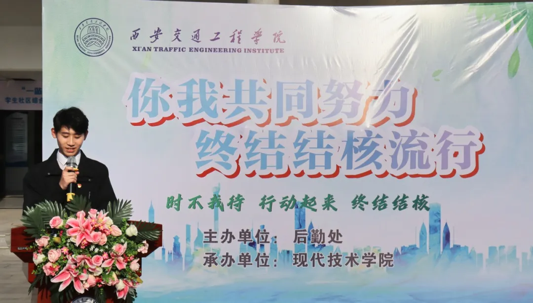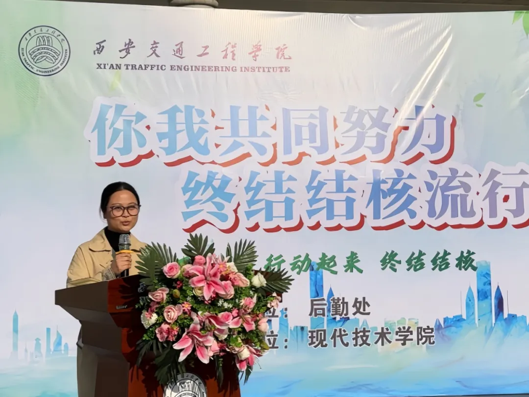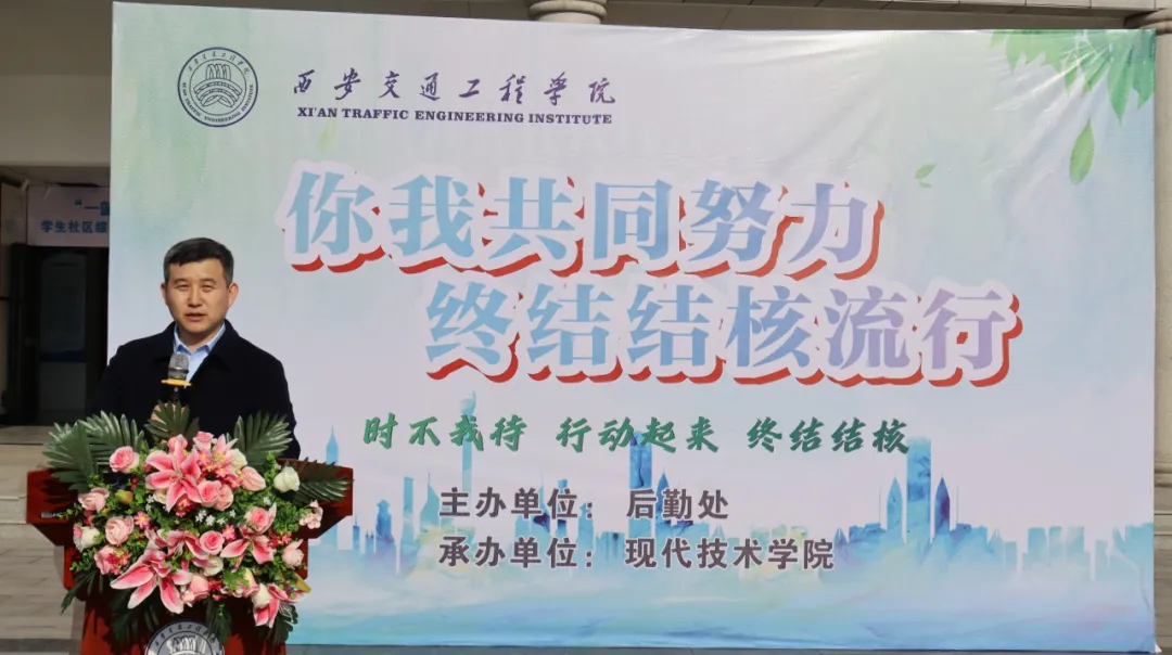 为进一步加强教育强国和健康中国理念教育,将健康理念贯穿学校教育教学、管理服务全过程,将健康宣教深入学生课堂,不断提高广大师生结核病防治意识和能力,积极构建“无核”和谐校园,共同终结结核流行。3月25日,由后勤保障处主办,现代技术学院承办的“你我共同努力 终结结核流行”世界防治结核病日系列活动启动仪式在学校图书馆西广场举行。鄠邑区疾控中心肺结核科王旦、鄠邑区人民医院结核病门诊屈阿宁医师,beat365副校长张学堂、赵征,学生处处长钱穆萨、副处长黄元元、后勤保障处副处长马红梅,现代技术学院全体辅导员以及部分学生代表共同参加活动。启动仪式由现代技术学院党委书记兼副院长田宏顺主持。