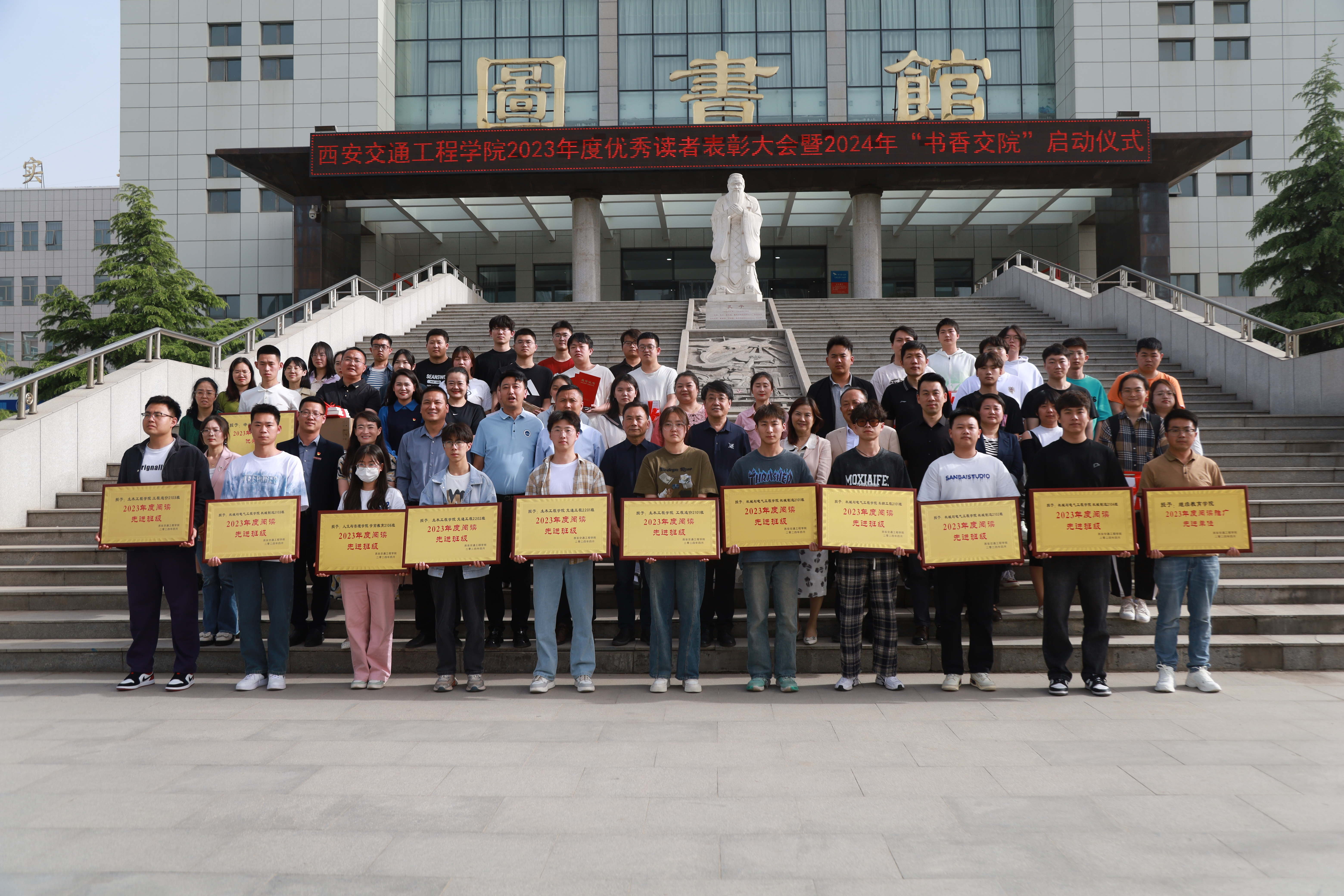 活动结束后,校领导与获奖单位和个人在图书馆门前台前合影留念。