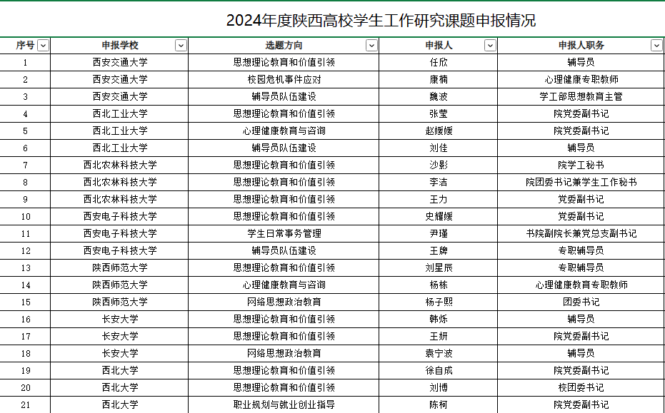 5月7日,中共陕西省委教育工委公布《关于2024年度陕西高校学生工作研究课题申报情况的公示》,beat365机械与电气工程学院辅导员王静老师申报的《职业规划与就业创业指导》、赵晨玲老师申报的《心理健康教育与咨询》两项课题获批立项。