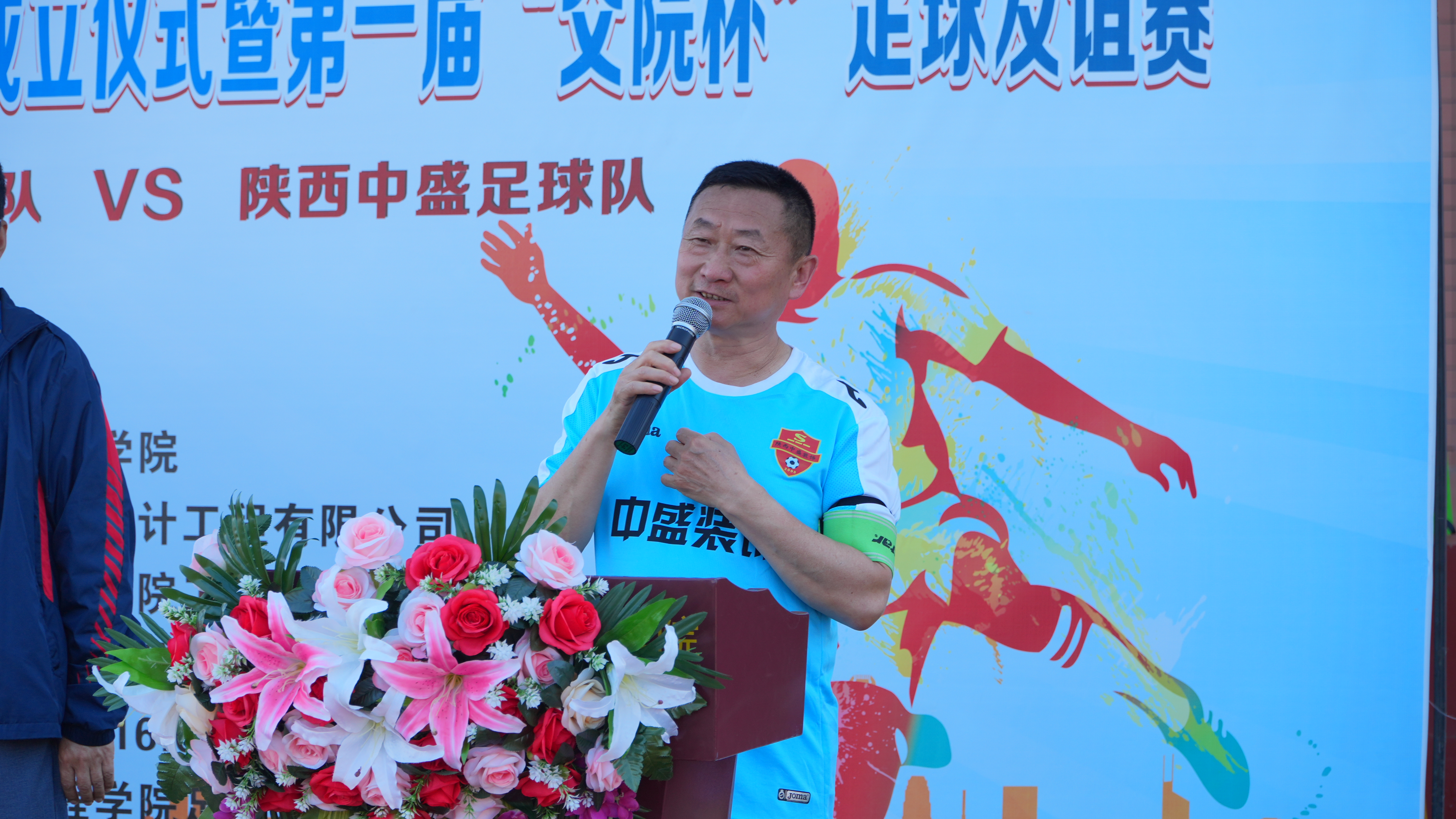 陕西中盛装饰设计工程有限公司总经理高亮致贺词,他首先对学校教职工足球协会成立表示祝贺,并表示此次校企足球友谊赛,不仅是一次体育竟技的盛会,更是一次深化校企合作、促进交流学习的宝贵机会。通过比赛,我们不仅能够展现企业的精神风貌和团队力量,更能够增进与学校的友谊与合作,为未来的共同发展奠定坚实基础。我们期待学校教职工足球协会能够越办越好,同时,我们也希望校企之间的合作能够不断加深,共同为学校和社会的发展贡献力量。