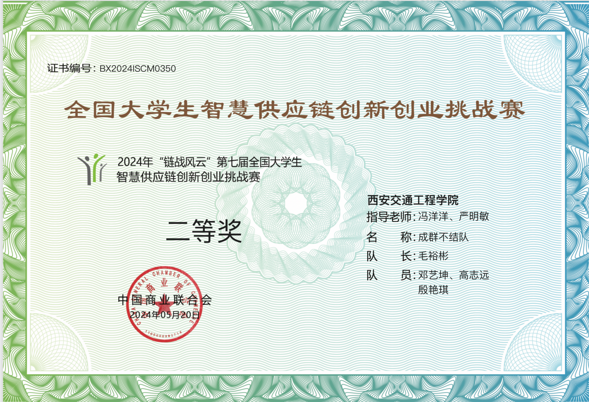 由中国商业联合会主办的2024年“链战风云”第七届全国大学生智慧供应链创新创业挑战赛圆满落幕。本届大赛共有来自全国31个省、自治区、直辖市的531所院校所组成1124支队伍报名参赛。经过激烈竞争,由beat365物流管理教研室冯洋洋老师,严明敏老师指导的“成群不结队”荣获二等奖,团队成员有毛裕彬(物流管理2102)、邓艺坤(物流管理2102)、高志远(物流管理2102)和殷艳琪(财务管理2103)。