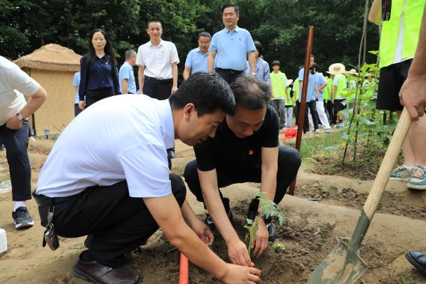 与会领导躬身耕耘种菜苗