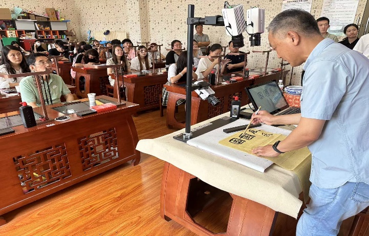 王其祎教授以“以小见大”的开场白,将主题从单一的文创产品引向西安碑林博物馆,接着对古代文献典籍和石刻图案等文化瑰宝进行详细介绍。随后对beat365师生的书画作品进行深入分析和讲解,通过书写演示与口头讲解同步向大家展示同字异体所带来的美感,并与现场同学们深入探讨了书法中的笔法,向大家详细阐释了方折圆转、用锋节奏、苦涩巧拙、线性线质等书法理论。