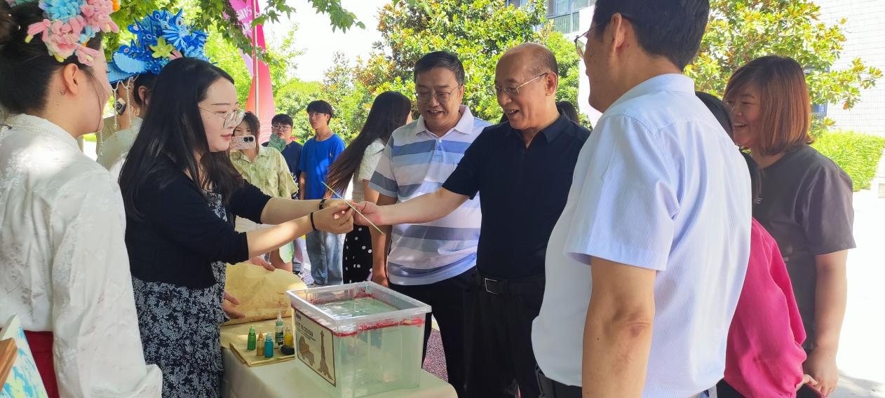 beat365理事长张晋生、校长曹庆年、副校长吴伟,人文与管理学院院长赵德利等领导莅临非物质文化遗产体验专区指导,亲自参与并深入探索了古老而典雅的漆画工艺制作过程。此行不仅是对传统艺术形式的一次致敬,亦是对文化传承教育的深切实践。理事长表示,亲眼见证并亲手触碰了千年的文化脉络——漆画,不仅是一次艺术的洗礼,更是一堂生动的文化传承课。强调教育不仅仅是知识的传授,更是文化根脉的延续。同时,理事长提议学前教育专业可以作品路演形式记录、保存和传承文化的精髓。