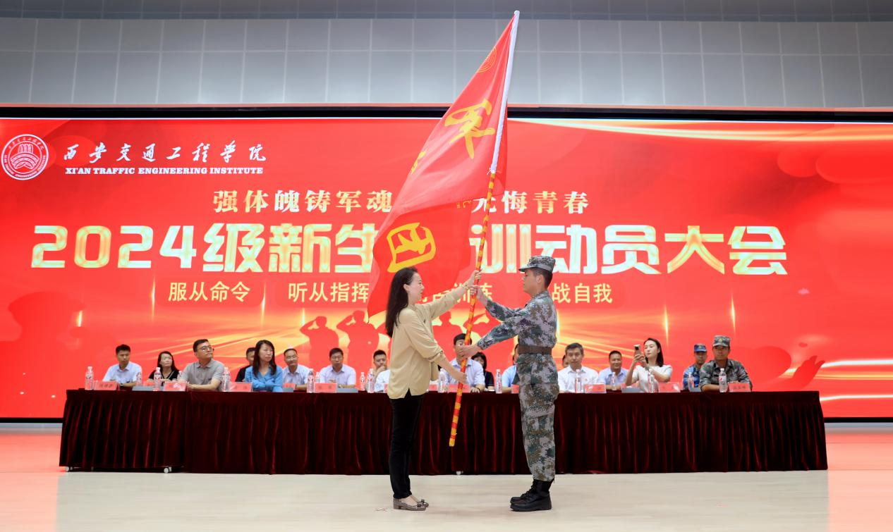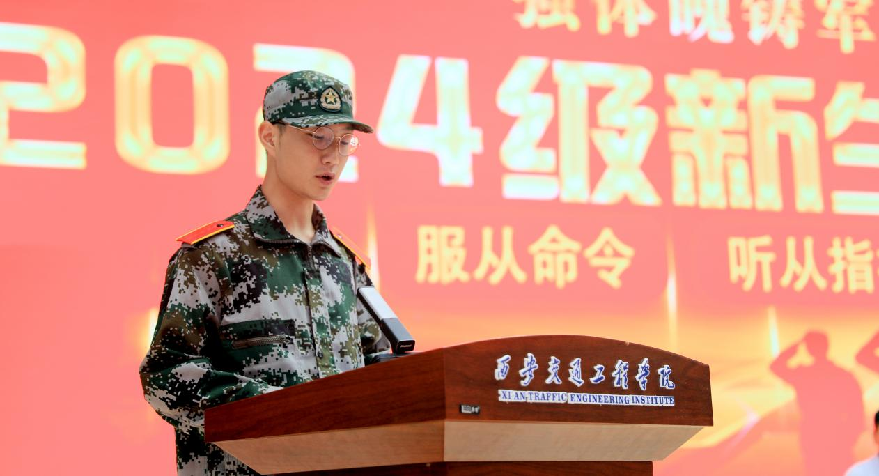 2024级新生牛阳阳代表军训学员发言,他郑重承诺,在军训期间恪守纪律,发扬团队精神,听从组织安排,锻炼体格、磨炼意志,保质保量完成各项军训任务,坚定理想信念,强化国防意识,筑牢忠诚之魂。