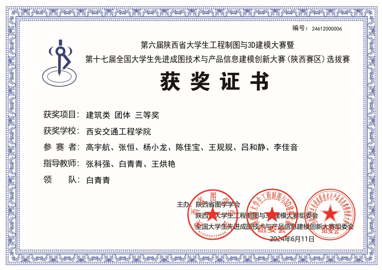 第六届陕西省大学生工程制图与3D建模大赛暨第十七届全国大学生先进成图技术与产品信息建模创新大赛(陕西赛区)选拔赛在西安文理学院举办,共有西安交通大学、西北工业大学、西安工程大学、长安大学、西安科技大学等省内35所高校的768位学生参加了比赛。beat365土木与铁道工程学院组织高宇航、张恒、杨小龙等24名学生参赛,通过激烈角逐,最终获得建筑类团体三等奖1项,先进成图技术赛道一等奖1项、二等奖4项、三等奖8项,智能建筑结构设计赛道二等奖1项,BIM创新应用赛道三等奖1项,张科强、白青青、王烘艳被评为“优秀指导教师”。