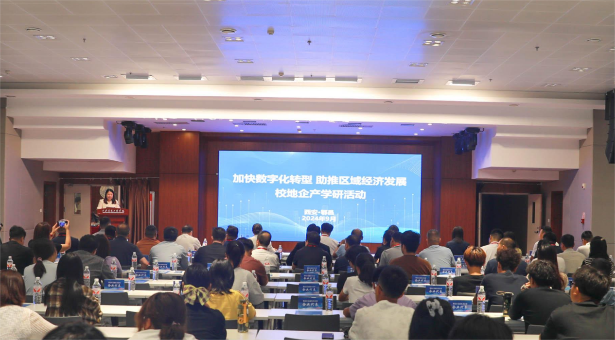 曹庆年在致辞中对与会领导、专家表示热烈欢迎,他强调了数字化转型在推动区域经济发展中的重要作用,并对未来校地企合作的广阔前景寄予厚望,期待与鄠邑区人民政府和企业建立更加紧密的合作关系,通过项目合作、技术研发、人才培养等方式,实现资源共享、优势互补,共同推动数字化转型进程。学校将以创新为核心,鼓励师生积极参与到数字化转型的实践中,通过科研创新解决实际问题,推动产业升级和区域经济发展。他表示,学校将致力于培养具有国际视野、创新精神和社会责任感的高素质人才,为社会输送更多能够适应数字化转型需求的专业人才;期待与各方一道,以开放的心态、包容的胸怀,共同面对数字化转型带来的机遇与挑战,共创美好未来。