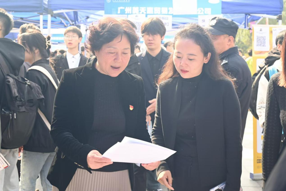 学校党委书记李萍(左一)、理事张慧(右一)了解毕业生就业情况