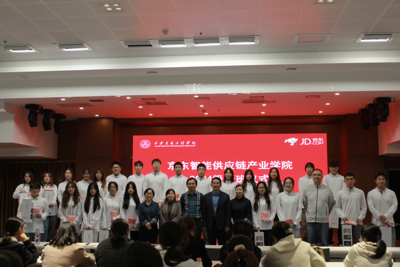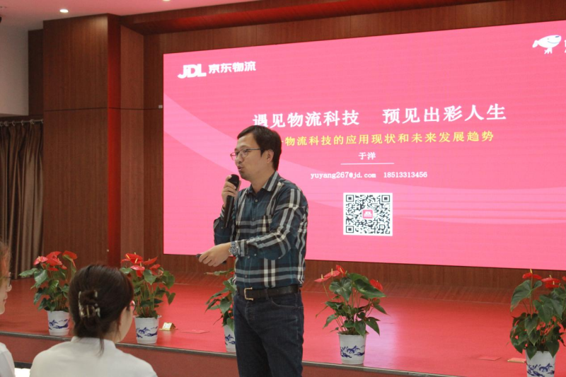 于洋作了题为“遇见物流科技,预见出彩人生”的主题讲座。解读了物流即链接无限世界。通过大数据技术、物联网技术和人工智能技术等实例,展示了科技进步为物流行业带来的巨大变革。他在讲话中表示,京东智能供应链产业学院是京东物流与高校深度合作、产教融合的重要成果。旨在通过整合双方优势资源,共同培养高素质、复合型、应用型的供应链人才。希望同学们接受到系统的理论学习、丰富的实践锻炼和前沿的科技创新训练,全面提升自己的综合素质和核心竞争力;与会老师为电子商务、物流管理两个专业的本科和专升本新生代表们发放了具有产业学院标识的学习用品并合影留念。