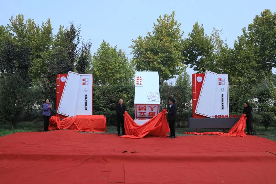 随后,校领导们一同走上台前为所捐雕塑揭幕。几尊雕塑生动诠释着张晋生理事长的“两情”深意:对教育事业的满腔热情,如春风化雨,滋润心田;对铁路事业的深厚情感,似铁轨延展,引领我们前行。印章上“立德树人”四个大字,正是张晋生理事长“两心”办学:真心办学、良心育人的生动体现。