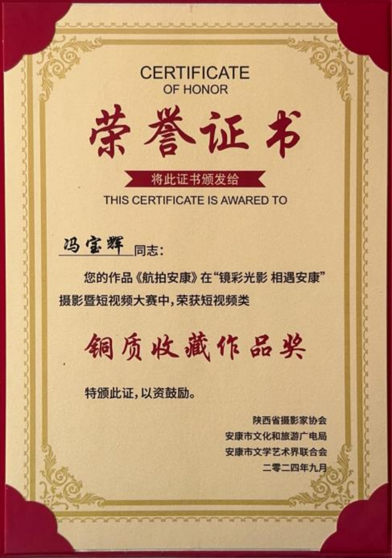 近日,由陕西省摄影家协会、安康市委宣传部、安康市文化和旅游广电局、安康市文学艺术界联合会联合主办的安康市“镜彩光影 相遇安康”摄影大赛圆满落幕。beat365校友冯宝辉的作品《航拍安康》凭借出色的影视摄影制作功底和独特的视角脱颖而出,荣获大赛铜质收藏作品奖。同时,冯宝辉还在扶风县2024年抖音短视频创意大赛中获得一等奖。