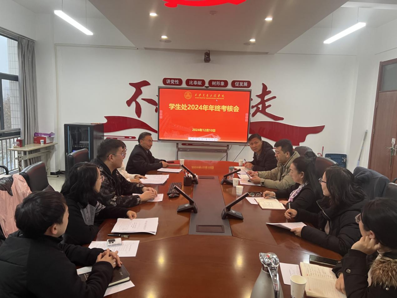 为落实立德树人根本任务,全面系统地梳理2024年工作成效,正确认识工作中的不足,明确工作方向、拓宽工作思维,不断提升学生管理水平,2024年12月10日下午,学生处在校务楼318会议室召开2024年年终考核会,副校长张学堂、学生处副处长黄元元及学生处工作人员参加会议。会议由学生处处长胡省利主持。