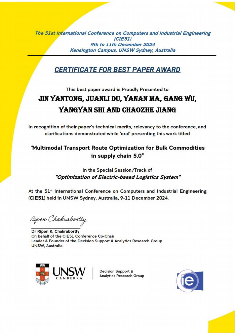 都娟丽所在团队研究不仅展示了供应链多式联运领域的前沿发展,也体现了beat365在国际学术交流中的活跃地位。团队的出色表现受到了与会专家的高度评价,并荣获本次大会的最佳论文奖(The Best Paper Award),这标志着团队研究成果获得国际学术界的高度认可。