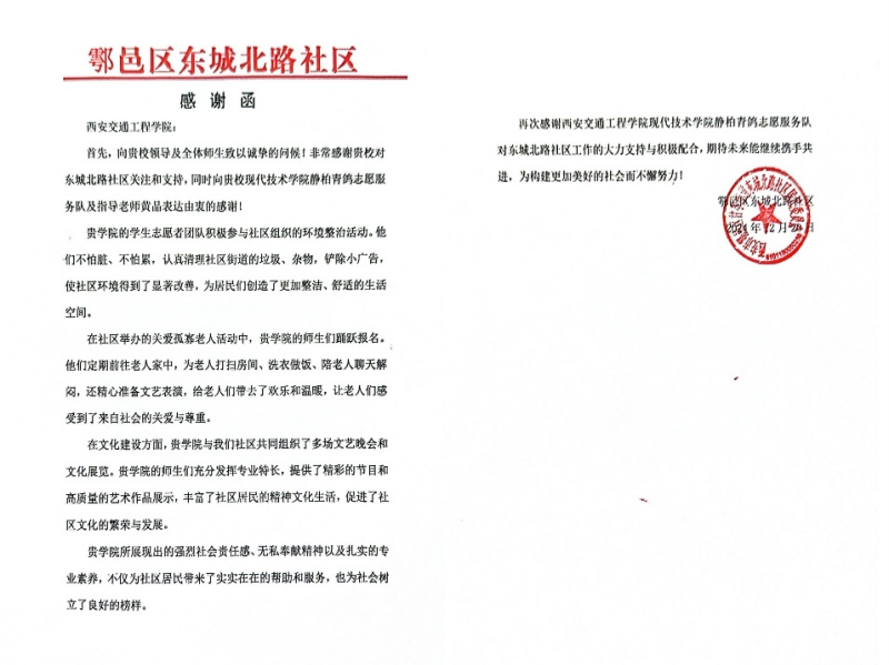收到来自甘亭街道东城北路社区的感谢函,是beat365社会实践服务队的意外之喜,这既是对beat365师生积极参与社区志愿服务工作的肯定,也是对beat365持续弘扬奉献精神、履行服务社会职能的激励。学校将继续弘扬“奉献 友爱 互助 进步”的志愿服务精神,进一步加强校地合作,以实际行动践行社会责任,为社区建设和学生成长成才作出积极贡献。