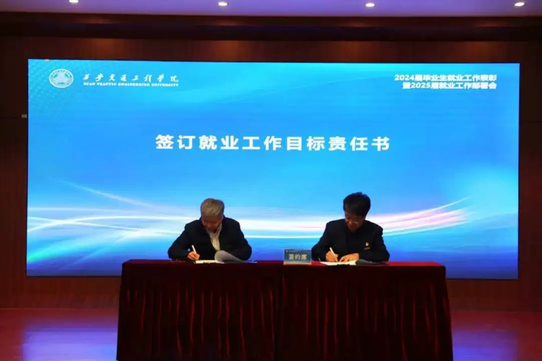 会议进行就业工作目标责任书签订仪式。校长曹庆年、副校长徐炜分别与交通运输学院院长崔炳谋、现代技术学院院长都娟丽签订2025届毕业生就业工作目标责任书,明确了2025年就业工作目标和任务。