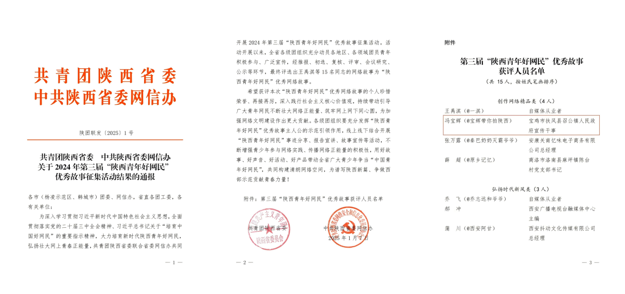 召公镇团委书记陈超表示,冯宝辉的事迹将被纳入青年典型宣传体系。作为第三届“陕西青年好网民”示范者,冯宝辉用行动响应了“网上讲好青年故事、网下担当社会责任”的号召。