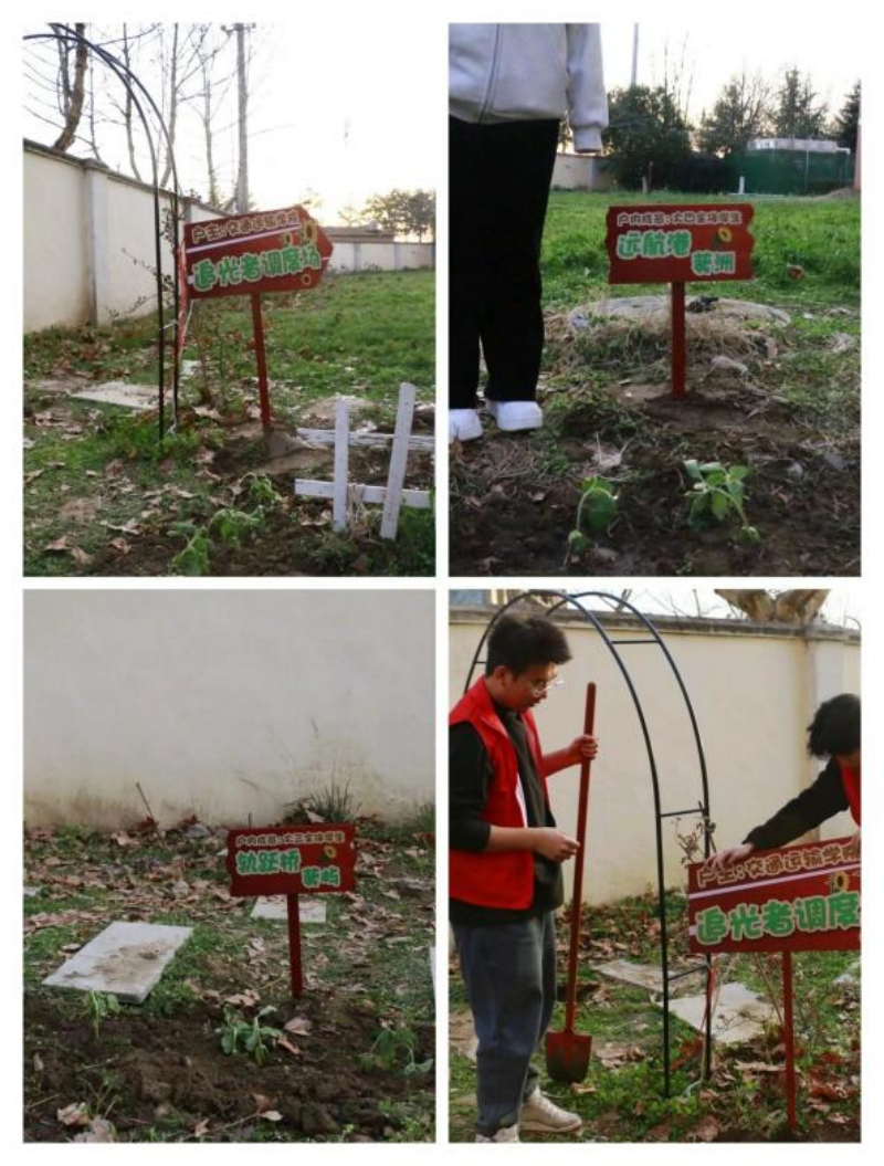 活动中,同学们认真学习种植向日葵的方法,并合力将园区种植围栏装设起来。在指定园区准备好的土壤中,大家用手指或小铲子挖出2 - 3厘米深的小坑,将种子尖部朝下放入坑中,在每个坑中放入种子,然后轻轻覆盖一层薄土。