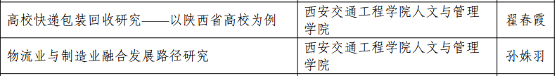 物流管理专业负责人翟春霞副教授主持的《高校快递包装回收研究—以陕西省高校为例》和青年教师孙姝羽老师主持的《物流业与制造业融合发展路径研究》获物流经济类课题立项,王妮娜老师主持的《基于残差修正 GM(1,1)贵州省农产品冷链物流需求预测研究》获物流管理类课题立项,参与以上项目的还有物流管理教研室主任刘红利副教授、物流管理骨干教师王娜副教授、青年教师严明敏、范培怡及杨爽等老师。