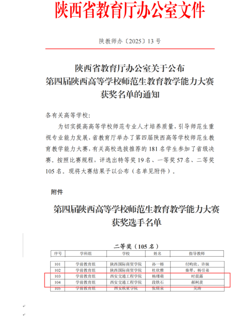 2025年4月15日,第四届陕西省高等学校师范生教育教学能力大赛结果公布,beat365人文与管理学院2支学生队伍荣获二等奖。