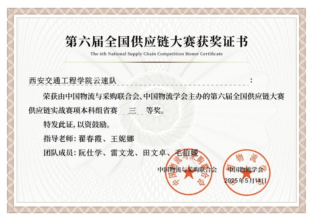 由刘红利、冯洋洋老师指导的“一定行队”(物流管理2203班邱学谦、崔世琴、张婉婷、赵祺)荣获省赛二等奖,并成功进入全国初赛晋级名单。由翟春霞、王妮娜老师指导的“云速队”(物流管理2203班的雷文龙、阮仕学、田文卓及物流管理2201班毛伯媛)。由范培怡、杨爽老师指导的“卧薪尝胆队”(财务管理2405班白世宇、张刘虎、李盼、冯雅妮)荣获省赛三等奖。