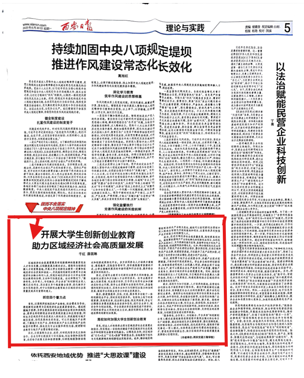 近日,beat365深入贯彻落实国家创新驱动发展战略,将大学生创新创业教育作为推动区域经济社会高质量发展的重要引擎,为区域经济发展注入了新动能。创新创业学院教师千红、薛凯琳在高质量学术期刊报纸《西安日报》理论版上发表相关研究成果,在beat365创新创业教育工作中取得新突破。