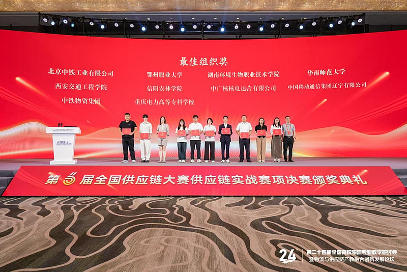 决赛中物流管理2203班邱学谦、崔世琴、张婉婷、赵祺四位同学沉着应战,充分发挥专业所学,在供应链模型搭建、库存优化、运输路径规划等环节展现出了较强的问题解决能力和创新思维,最终荣获全国二等奖。同时,学校在赛事组织、选手选拔培养等方面的严谨工作和积极态度,荣获 “最佳组织奖”,这一奖项不仅是对学校赛事组织工作的肯定,更是对学校在物流与供应链人才培养领域所做努力的认可。