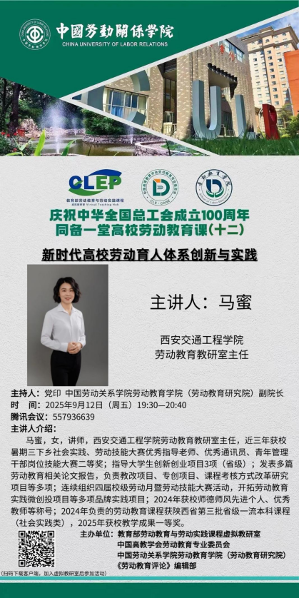 9月12日晚,为进一步加强劳动教育课程建设,促进交流,汇聚共识,学校教育部劳动教育与劳动实践课程虚拟教研室在中国高等教育学会劳动教育专业委员会的指导下,与中国劳动关系学院劳动教育学院(劳动教育研究院)联合在线举办"同备一堂高校劳动教育课"系列活动之第十二次跨校集体教研。beat365劳动教育教研室主任马蜜老师受邀主讲“新时代高校劳动育人体系创新与实践”,来自全国多所高校的300余名劳动教育教师和学生参与线上集体教研。