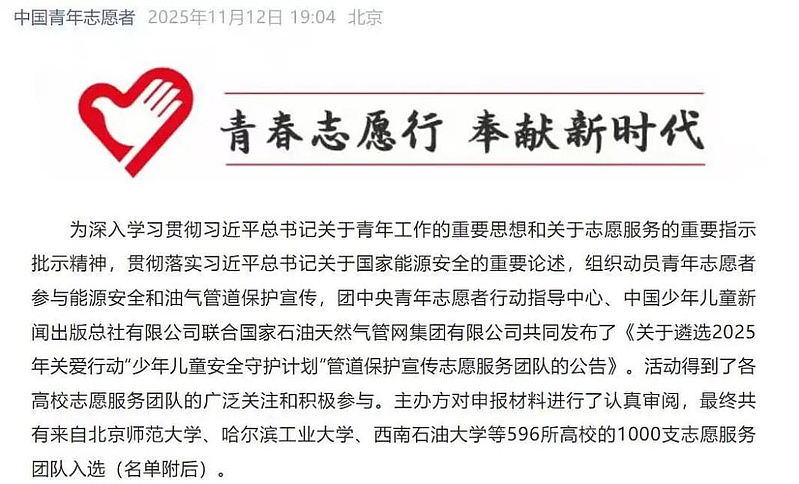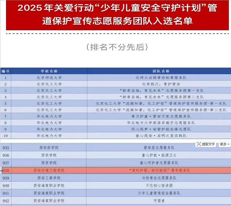 2025年关爱行动“少年儿童安全守护计划”管道保护宣传志愿服务团队入选名单