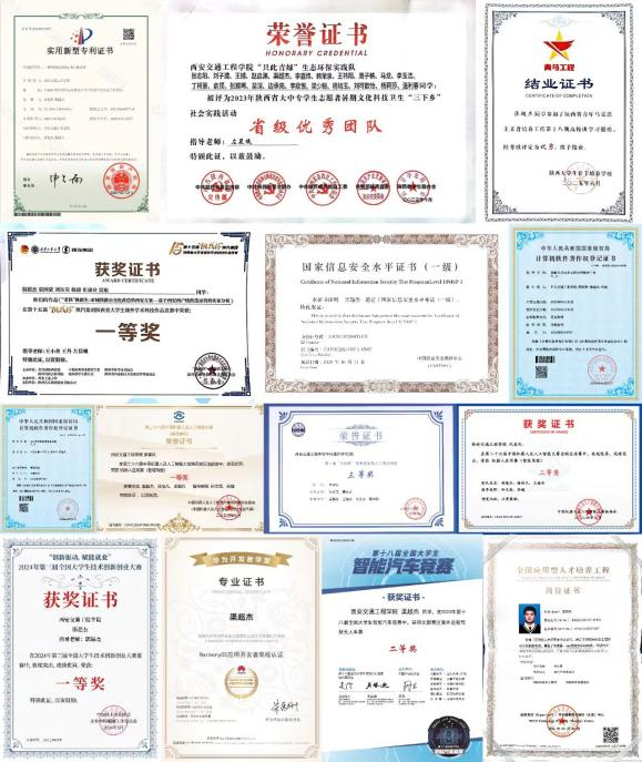 在学术科技领域,渠超杰屡获佳绩,被誉为“获奖能手”。他依托专业背景,积极参与各类竞赛,成果显著,其中包括:陕西省第十五届“挑战杯”大学生课外学术科技作品竞赛一等奖、2024年第三届全国大学生技术创新创业大赛陕西省一等奖、第二十六届中国机器人及人工智能大赛全国三等奖及陕西省一等奖、第十八届全国大学生智能汽车竞赛北部赛区二等奖、中国国际大学生创新大赛(2025)陕西省赛区复赛三等奖等。此外,他还主持或参与大学生创新创业计划项目省级三项、校级五项,累计荣获各类荣誉奖励50余项,充分展现了其扎实的学术能力和不懈的奋斗精神。