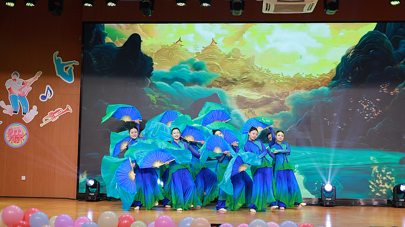 除了精彩的舞蹈比拼,穿插节目同样亮点纷呈。校园好声音获奖选手牛艳阳带来的歌曲《给你一点颜色》,堪称传统与创新的完美融合 —— 将摇滚的脉搏与 “中国最古老摇滚” 华阴老腔的粗犷魂魄相融,苍劲呐喊遇上电吉他嘶鸣,古老叙事碰撞现代表达,独特的艺术张力让全场为之震撼;主持大赛获奖选手杨蓓颖同学的讲述《厚植情怀 挺膺担当》深情真挚,字里行间传递出艺术背后的精神力量,让现场观众在聆听中感悟新时代交院人的责任与担当;大学生艺术团的歌伴舞《是我,也是我们》以温暖旋律和整齐舞姿,诠释了个体与集体的交响,“我是浪花一朵,投身大海的壮阔” 的歌词,更是引发全场师生的强烈共鸣。