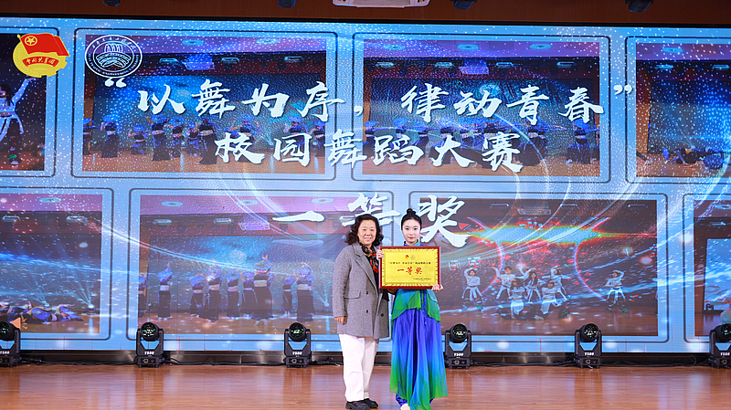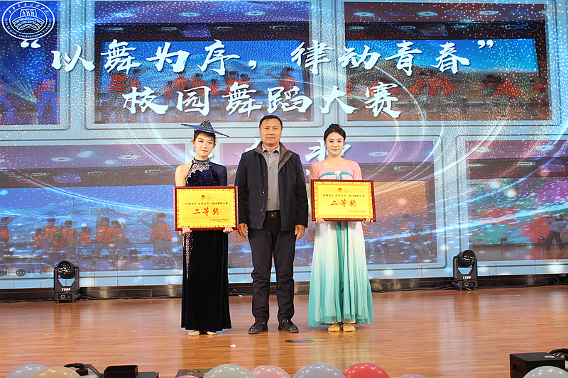 学生处处长胡省利为舞蹈大赛二等奖获奖单位颁奖