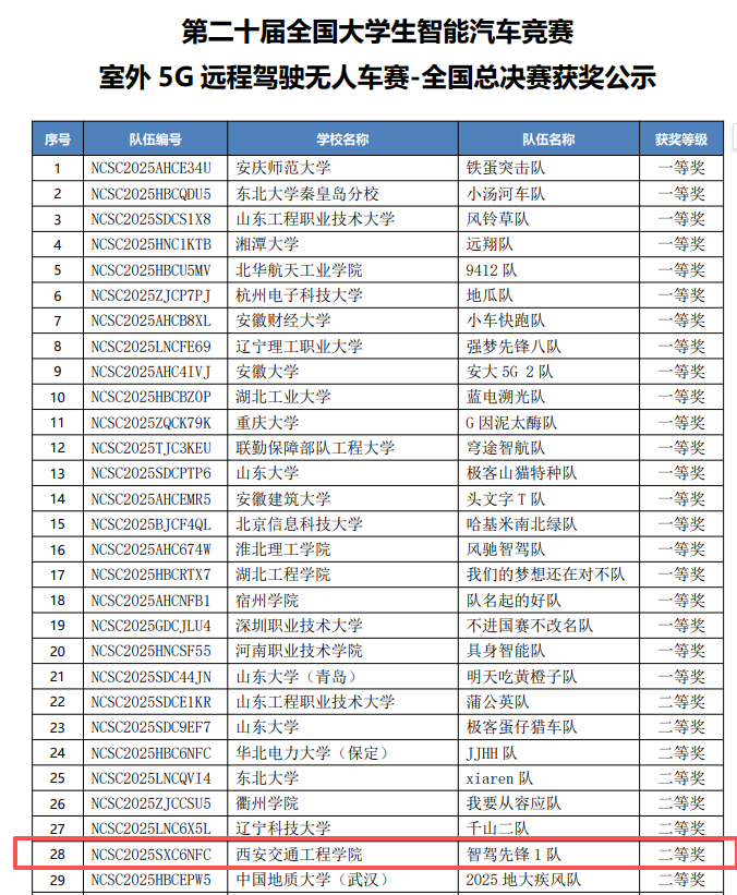 本次全国赛是在区域赛的选拔基础上进行的,通信与人工智能学院智驾先锋 1 队在教师牛作领和孙文高带领下凭借出色的技术创新能力、扎实的专业基础和稳定的现场发挥,在激烈的角逐中脱颖而出,实现了在区域赛一等奖和全国赛二等奖的好成绩,圆满的完成了本次竞赛的既定任务。