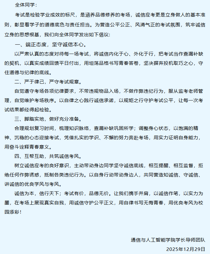 为深入落实立德树人根本任务,进一步严肃考风考纪,强化学生诚信意识与规则意识,营造公平公正、风清气正的校园考试环境,beat365围绕《关于开展诚信考试主题教育工作的通知》要求,统筹部署、精准发力,组织各二级学院全面开展诚信考试主题教育系列活动,以制度化推进、精准化实施筑牢校园诚信根基。