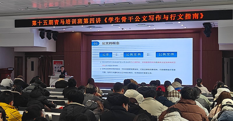 为提升学生工作的规范性与专业性,党委宣传部部长界威锋带来了极具实操性的《学生骨干公文写作与行文指南》。课程从常见错误案例入手,分模块详细讲解了通知、请示、总结等常用文体的规范格式与写作要领。通过“错误示例—修改示范—现场仿写—即时点评”的闭环教学,学员们快速掌握了公文写作的核心技巧与“专业感”。