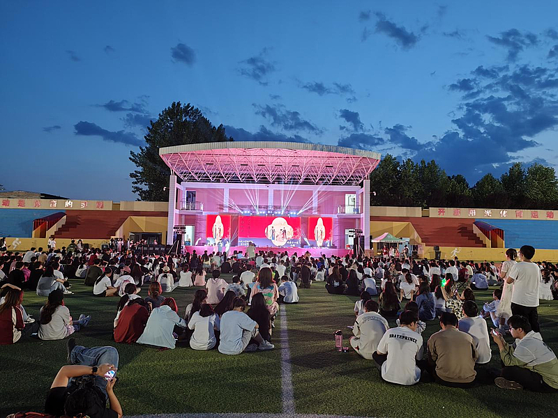 在傍晚的微风中,体育场草坪被灯光渲染一新,音乐会以《美丽的神话》拉开序幕,空灵旋律瞬间将观众带入唯美国风世界。随后,《九张机》《桃花诺》以缠绵词曲演绎古典情思,而《身骑白马》《赤伶》则用激昂戏腔点燃全场。《水云谣》《叹云兮》以柔美声线勾勒山水意境,《画心》《春风十里》则用现代编曲诠释传统韵味。当《青花瓷》前奏响起,观众随旋律沉浸于江南烟雨之中。大学生艺术团团长、2022级音乐学学生刘亮带来的《招摇》和团总支书记、音乐硕士杜涵静老师的《茶花开了》将整个音乐会推向高潮。以飒爽曲风展现侠义精神,最终音乐会在合唱《偏爱》的深情演绎中圆满落幕。