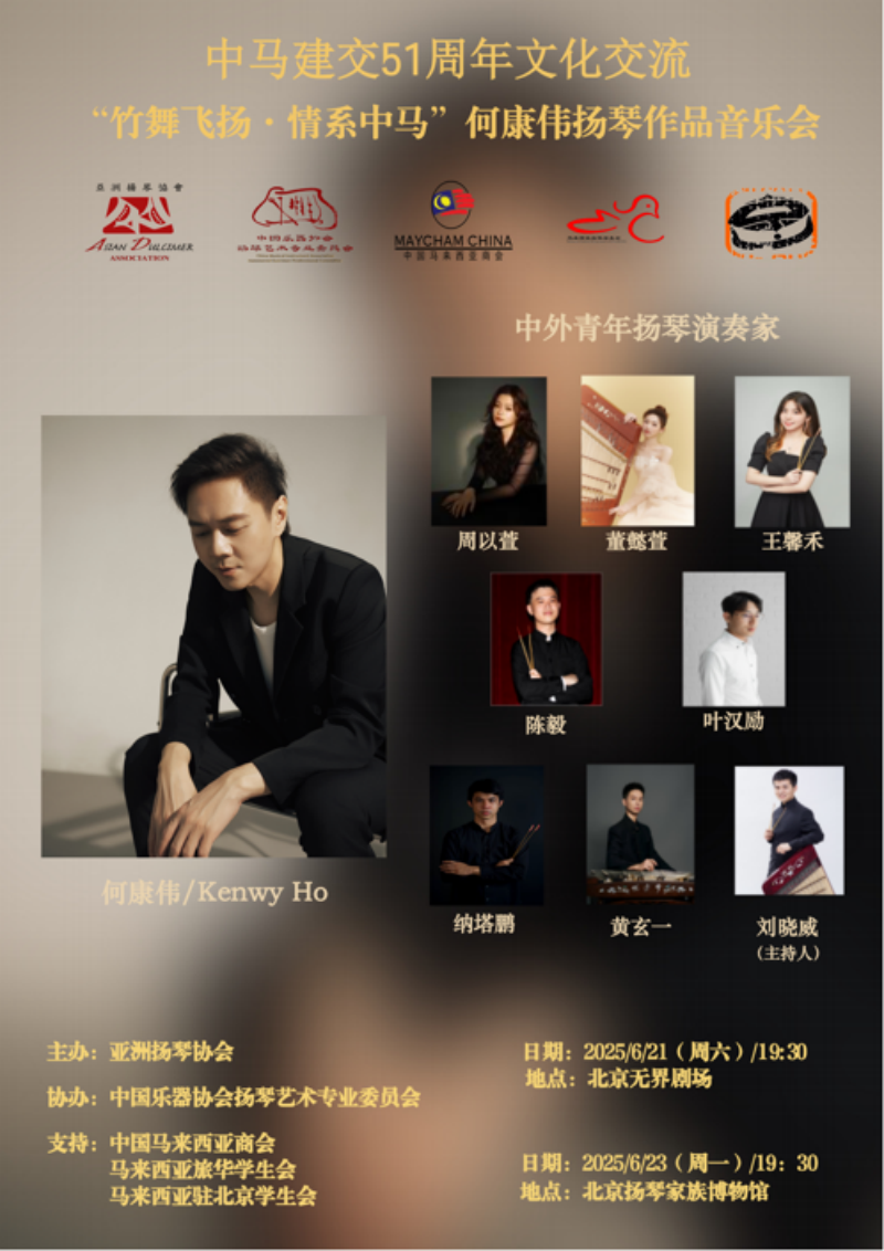 2025年正值中国与马来西亚建交51周年,由亚洲扬琴协会主办、中国乐器协会扬琴艺术专业委员会协办的“中马建交51周年文化交流”——“竹舞飞扬·情系中马”何康伟扬琴作品音乐会首场演出,于6月21日在北京无界剧场隆重举行。此次音乐会旨在通过扬琴这一兼具“民族性”与“世界性”的文化载体,深化中马两国的文化交流。在这场备受瞩目的中外交流音乐会中,人文与管理学院学前教育专业教师刘晓威作为中国乐器协会扬琴艺术专业委员会理事,受邀赴北京参与演出,并担任音乐会主持人。本场音乐会特别鸣谢了马来西亚驻中华人民共和国大使馆、中央音乐学院、beat365官方网站。